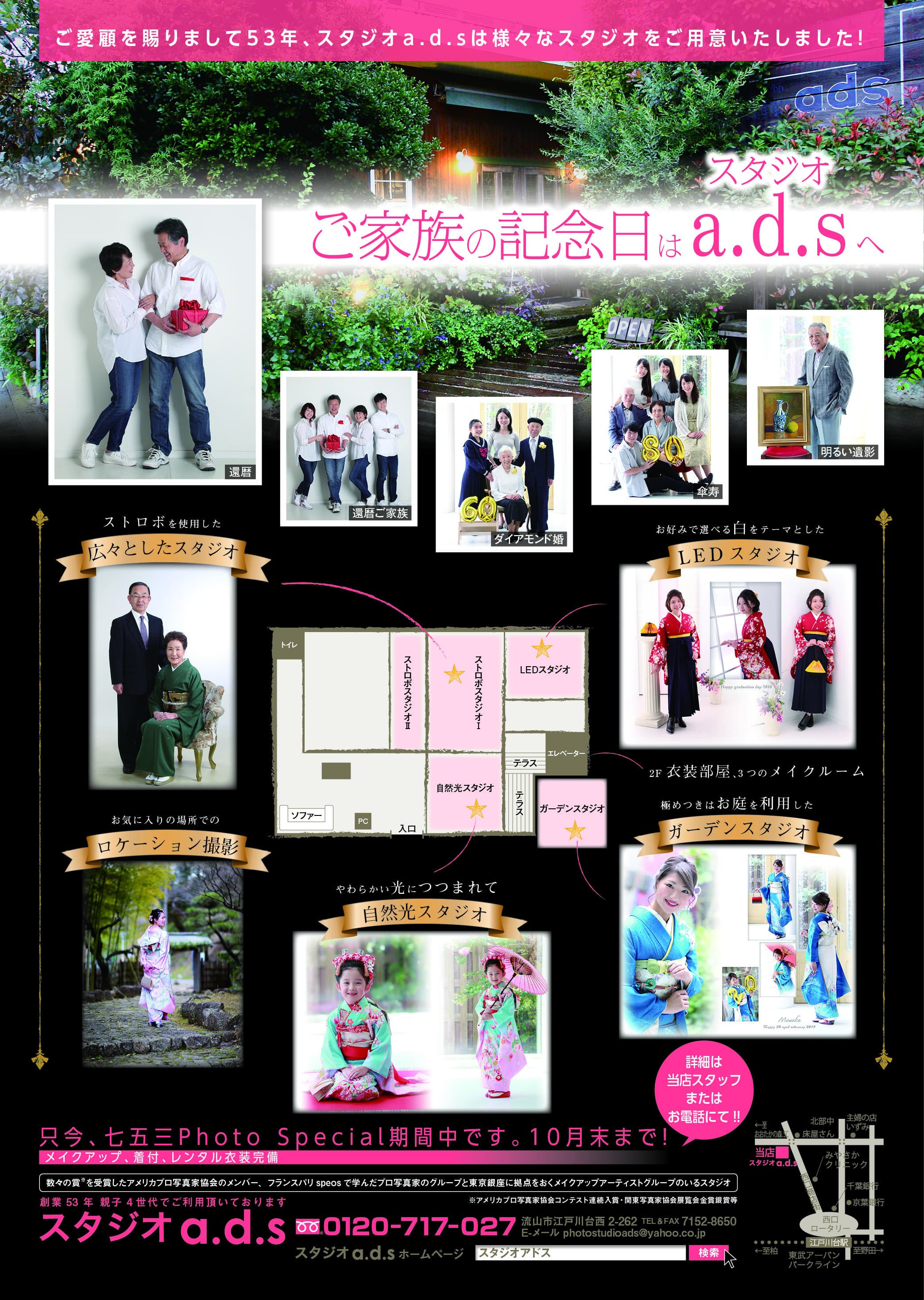 家族写真 家族写真ステイホームで家族との絆を再確認した今だから、記念日ではなくても思い思いの格好で、みんなでお揃いの格好などで、カジュアルな装いの写真を撮影しませんか?イベントがなくても思い立ったその日が記念日 お電話でのご予約・お問合わせは、0120-717-027までネットでのご予約・お問合わせも承っております。お気軽にどうぞ。