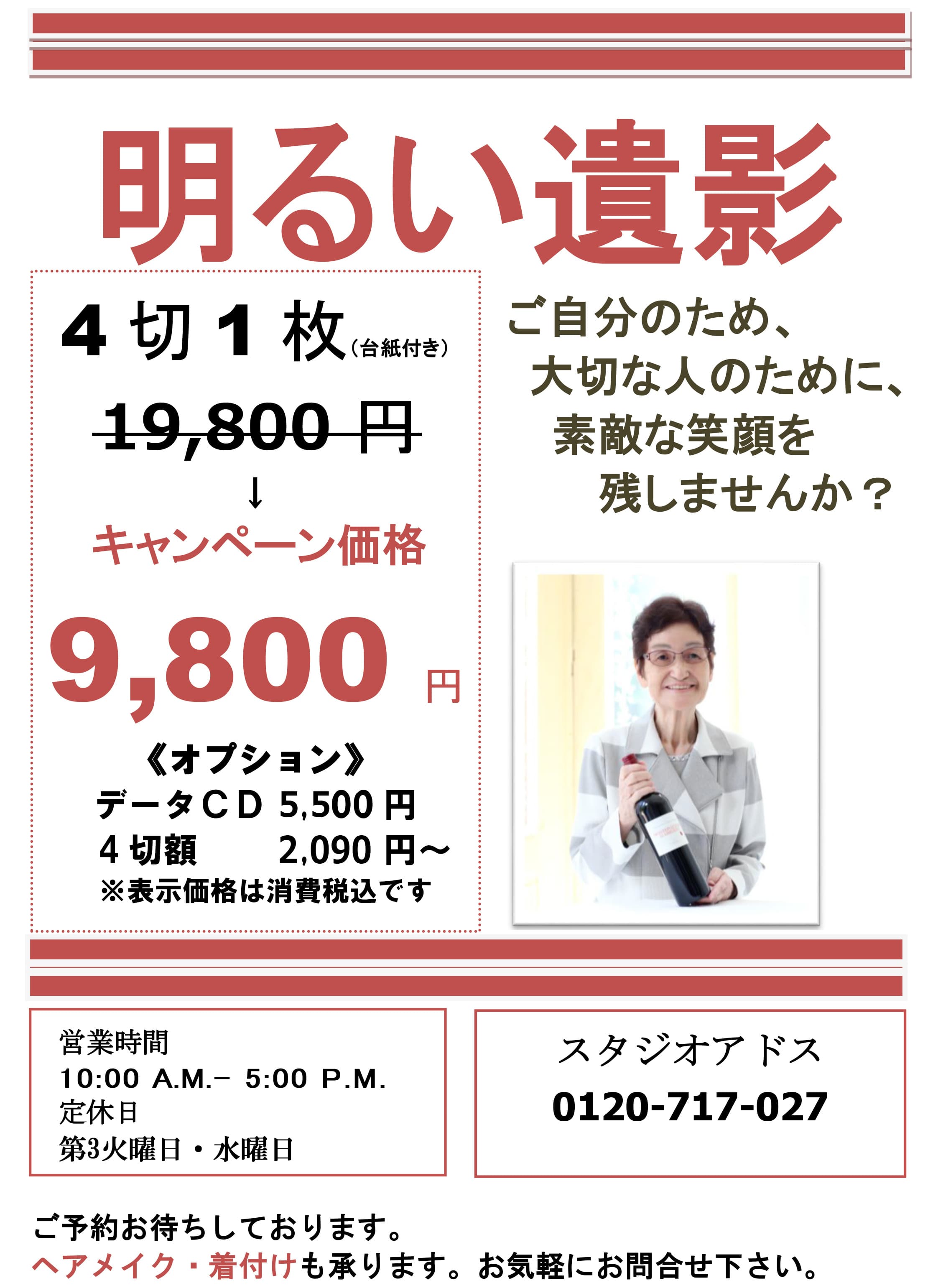 遺影写真 明るい遺影写真自分のお気に入りの写真はお持ちですか?大切なご家族のためにもあなたの笑顔を写真に残しませんか?趣味を活かした楽しい写真・お気に入りの装いで、いつか訪れるその日に備えて、あなたらしい姿を・・・ お電話でのご予約・お問合わせは、0120-717-027までネットでのご予約・お問合わせも承っております。お気軽にどうぞ。